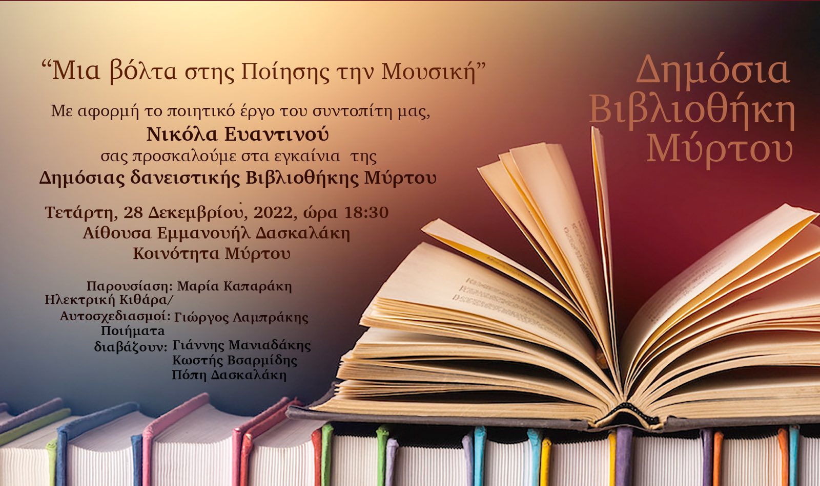 σας προσκαλούμε στα εγκαίνια της Δημόσιας δανειστικής Βιβλιοθήκης του Μύρτου.
