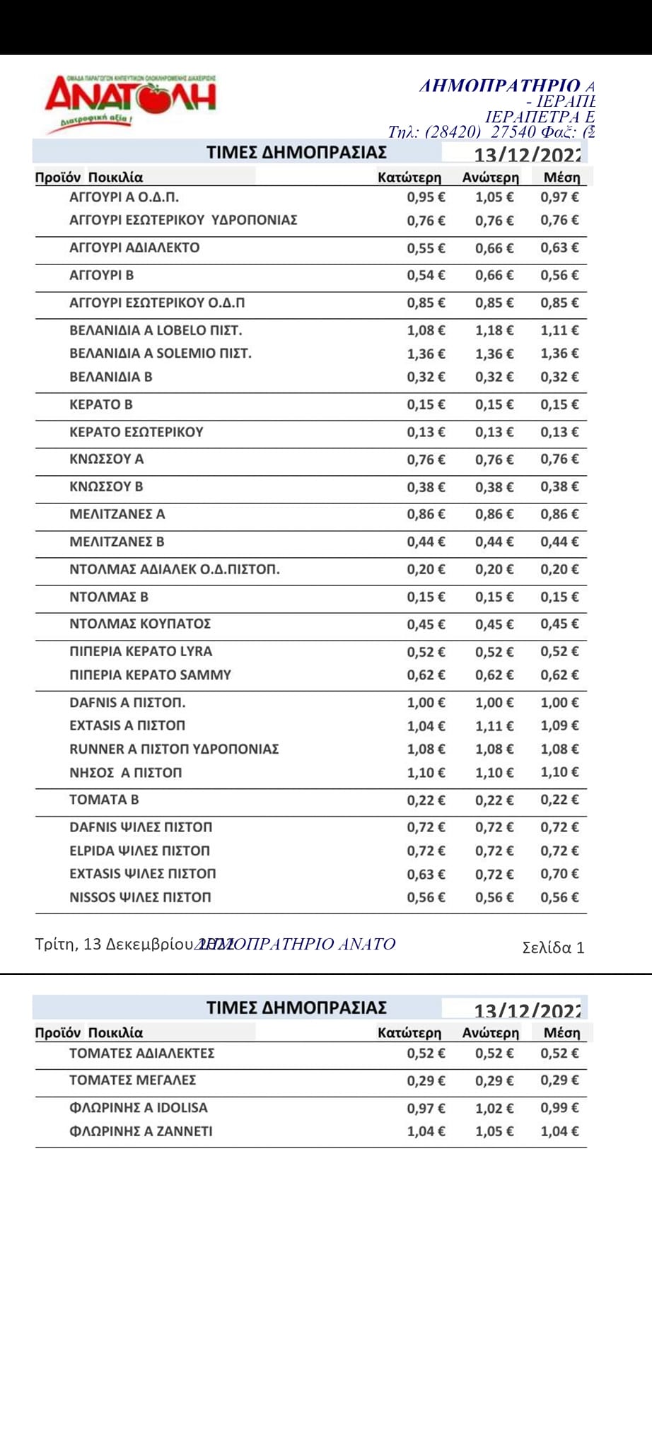 Τιμές κηπευτικών Ιεράπετρας 13-12-2022